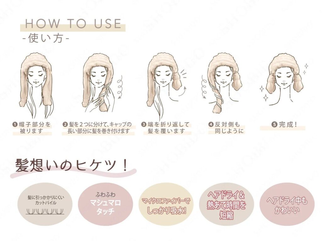 キャップの両側に長い耳があり、髪を左右に分けて耳にくるくる巻き付けるとしっかり吸収されるようになっています!🐰