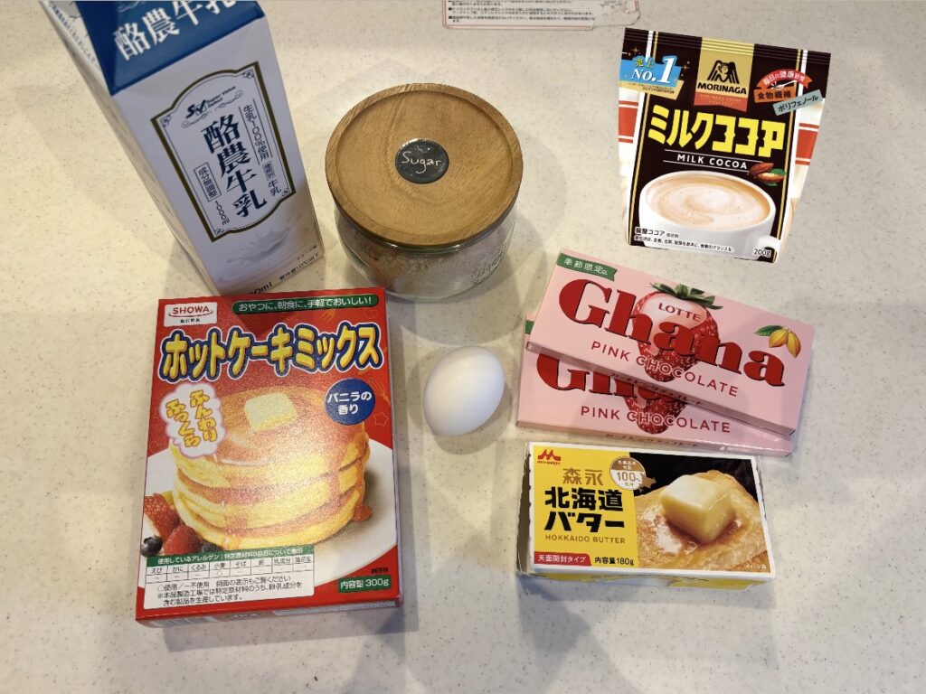 卵(1個)→砂糖(30g)→牛乳(大さじ2)→ホットケーキミックス(50g)→ココア(小さじ2)→溶かしたバター