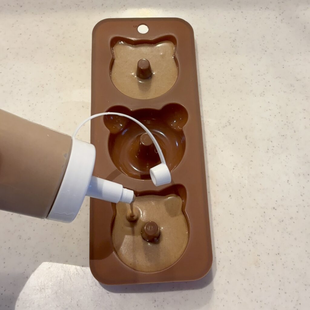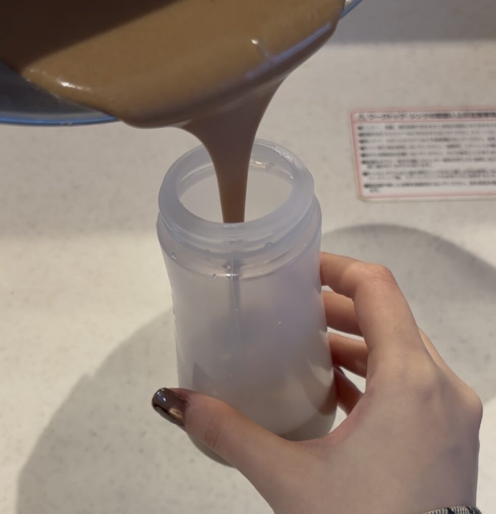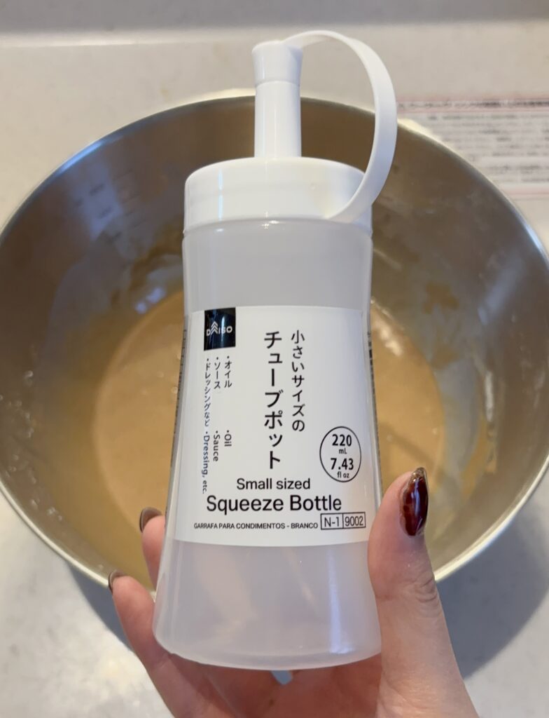 できた生地は、ダイソーのドレッシング入れに移しておくと、生地が入れやすくなるので失敗しにくい✨