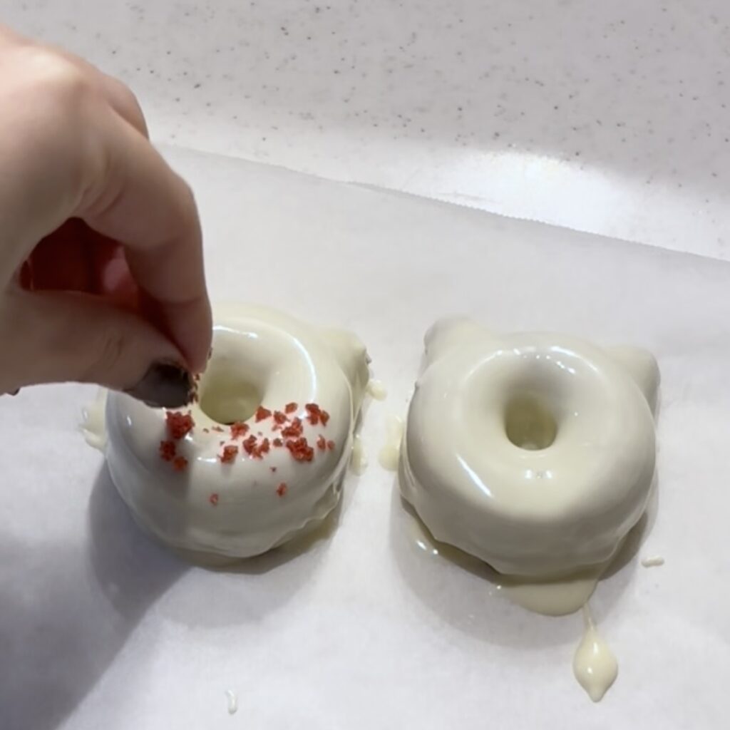 ドーナツの上からまんべんなくチョコをかけてね🍩