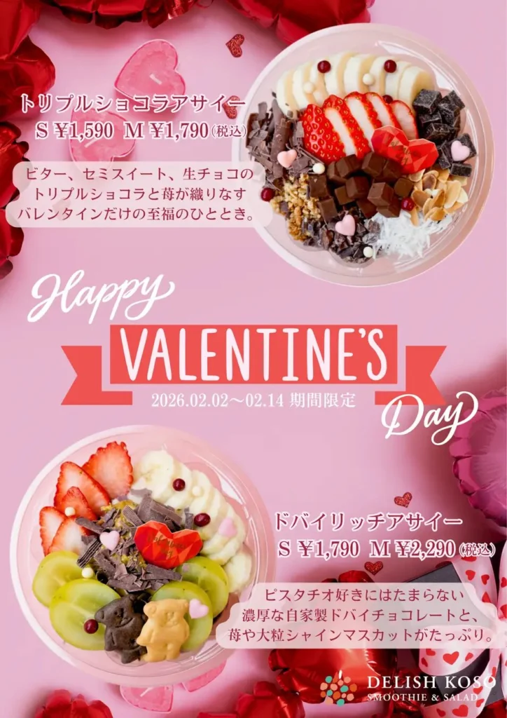 2026年2月2日(月)から2月14日(土)までの期間限定で、バレンタイン特別メニュー「トリプルショコラアサイー」と「ドバイリッチアサイー」の2種類が販売されるよ♡🍫