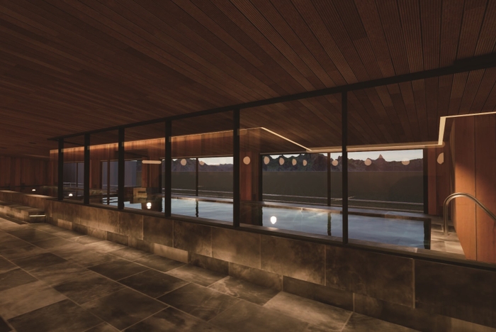 4階フロアに新たに展望風呂を新設いたします。これにより、雄大な恵那峡の眺望をより楽しみながら、良質な温泉をご堪能いただけます。既存のB1フロアの2ヶ所にあった大浴場と露天風呂は1つに統合し、広々とした大浴場と露天風呂になります。どちらのお風呂も男女入替制ですので、入浴の楽しみが広がります。