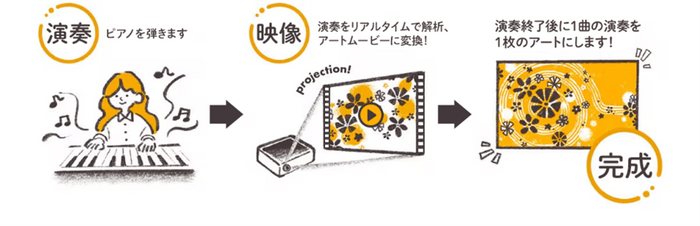 電子ピアノで弾いたメロディが、世界に一つだけのアートムービーとオリジナルの画像 として形になります。アートムービーとオリジナルの画像は大型スクリーンでお楽しみいただけます。