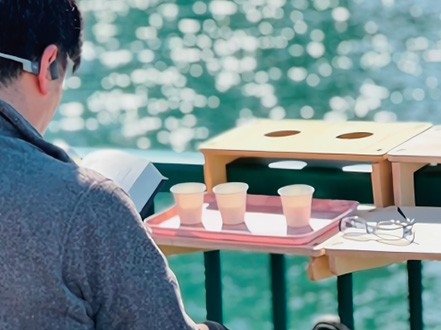 テラスの手すりやテーブルを活用したポータブルカウンター「mizube bar」が川沿いに登場。隅田川の美しい景色を眺めながら、ゆったりと飲食を楽しめます。