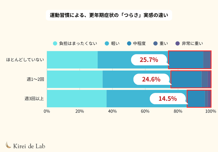 さらに、運動を週3回以上行っている人では、更年期症状の負担が「中程度以上」と回答した人が14.5%と低く、「ほとんどしていない人」(中程度以上:25.7%)よりも軽く感じる傾向が見られました。