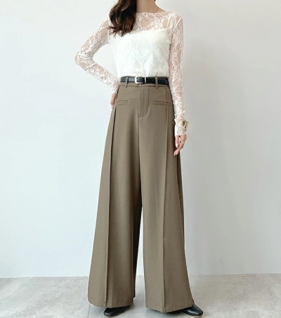 今季注目のブラウンを選び、レースのシースルートップスで大人のエレガンスをプラスすれば、ワンランク上のおしゃれコーデの完成!
