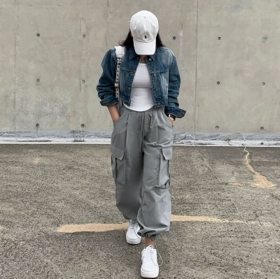 こちらはカジュアル派におすすめのコーディネート。適度な厚みの生地に、ストリート感のある立体ポケット&裾ストリング付きのパンツです。