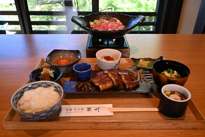 ⾃らの脂で上がった炭⽕の煙を纏い、⾷欲をそそる⾹りが付いた国産鰻に⾨外不出のタレをかけた極上の逸品の他、御膳には京都が誇る旬の⾷材もご⽤意しております。