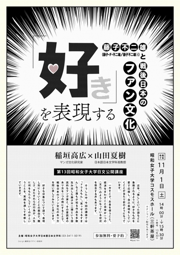 昭和女子大学(学長 金尾朗:東京都世田谷区) 人間文化学部 日本語日本文学科は、第13回公開講座「「好き」を表現する 藤子不二雄(藤子・F・不二雄/藤子不二雄Ⓐ)と戦後日本のファン文化」を11月1日に開催します(参加費無料)。国民的なマンガ家、藤子不二雄とその愛読者のあり方を一つの例に戦後日本のファン文化のあり方を考えていきます。