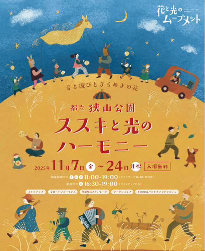 2025年秋の開催場所は、多摩湖の水の恵みに包まれ、武蔵野の里山の風景や自然が今も色濃く残る「狭山公園」。秋のススキとともに自然の光や音も合わせた、ここでしか体感することのできない花と光の演出を11月7日(金)~24日(月・祝)の期間中の10日間(金・土・日・祝日のみ開催)に行います。豊かな自然と光と音楽が織りなす秋の狭山公園をお楽しみください。