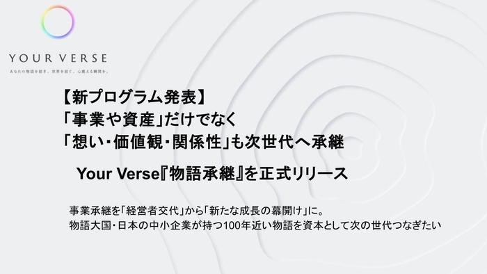 株式会社Your Verse(東京都足立区、代表取締役:長谷川朋弥)は、50年以上続く中小企業を対象に、企業が数世代に渡って大切に紡いできた「見えない資産」である創業の想い、現場の誇り、地域との絆などを次世代の経営資源へ編み直す新サービス『物語承継』を正式リリースしました。