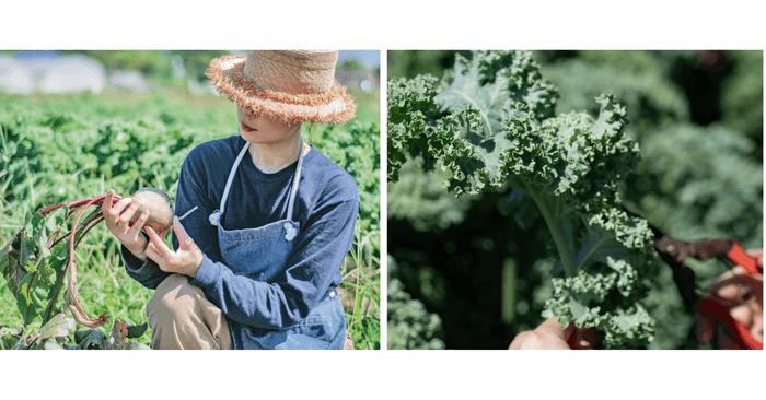 収穫時には「香り」「茎のハリ」「葉のツヤ」など、嗅覚、触覚、視覚を使い収穫のタイミングを見極めます。カリーノケールやビーツ、カラフルにんじんなどの品種は通年で栽培。手間をかけて収穫された野菜は、採れたての新鮮さそのままに、すぐに店舗へ直送されます。