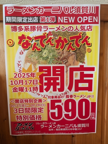 今回の須賀川店では、なんでんかんでんの本格的な豚骨スープをベースに、地元福島の食材を活かした限定メニューも企画中。ラーメン好きの皆さま、地元の皆さま、観光でお越しの皆さまの期待に応える“ラーメンの祭典”をお届けします。