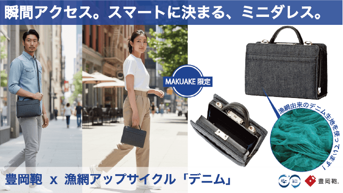 本クラウドファンディングでは、環境に配慮した廃棄漁網由来の生地を使用した「豊岡鞄認定品」など、ここでしか手に入らないMakuake限定の特別なリターンを販売中です。伝統の技と革新的な素材が融合した、特別なラインナップにご注目ください。