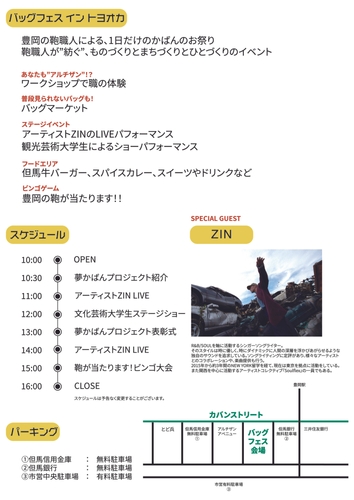<内容> 豊岡鞄の展示販売、職人によるものづくり体験、飲食ブース、「夢のかばんプロジェクト 2025」の制作品発表・贈呈式など。