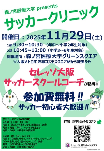 2025年11月29日(土)、森ノ宮医療大学(学長 青木元邦、大阪市住之江区)は、本学の複合型スポーツ施設(グリーンスクエア)にて『森ノ宮医療大学presentsサッカークリニック』を開催します。本イベントではオフィシャルスポンサー契約を結ぶセレッソ大阪より、サッカースクールのコーチを招き、幼児から小学6年生を対象に行います。