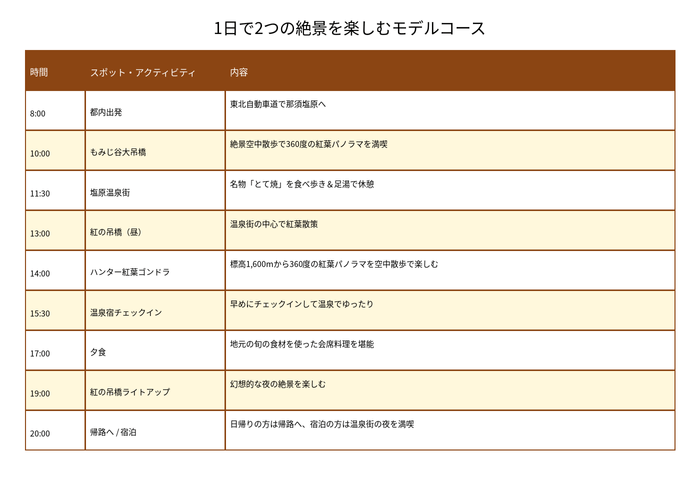 (例)都内出発 → もみじ谷大吊橋で絶景空中散歩 → 塩原温泉街で名物「とて焼」を食べ歩き&足湯で休憩 → 紅の吊橋(昼の姿をチェック) → ハンター紅葉ゴンドラで標高1,600mから360度の紅葉パノラマを空中散歩で楽しむ → 温泉宿で早めの夕食 → 「紅の吊橋」ライトアップで幻想的な夜景を堪能 → 帰路へ