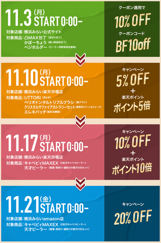 横浜みらいのBLACK FRIDAYは、年に一度の感謝企画です。オフィシャルストア、楽天市場店、amazon店、それぞれのモール毎に異なる特典をご用意し、リピーターの皆さまにも、はじめての方にも、今年多くのメディアに取り上げられた、個性豊かな「ののじ」ブランドの製品をお得にお買い上げいただけるキャンペーンを企画いたしました。ぜひこの機会をご利用ください。