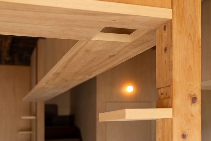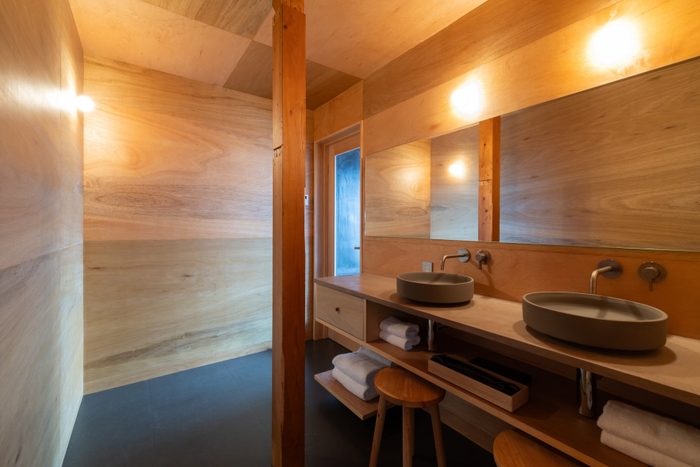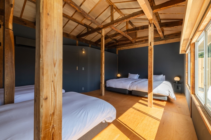 寝室については、1階の寝床はワンルームの中でみんなと過ごしながら寝たいとき、2階の寝室はよりプライベートな環境で落ち着いて過ごしたいとき、といったように、気分に合わせて過ごす場所を変えることもできます。また二世帯や友達同士で宿泊される際には、グループごとに分かれて使うことも想定して計画しています。