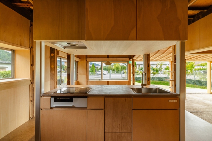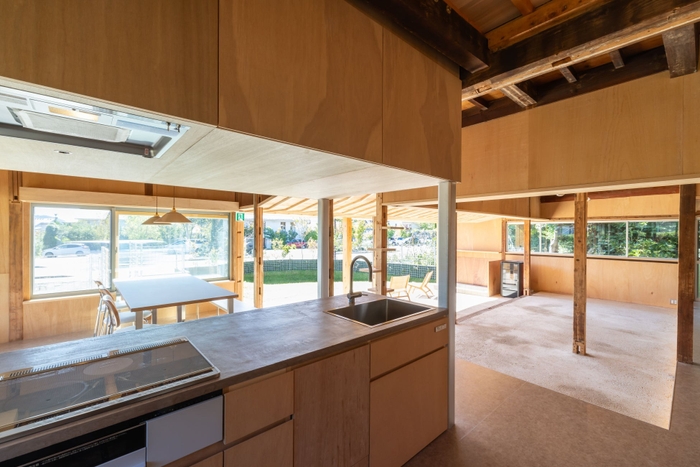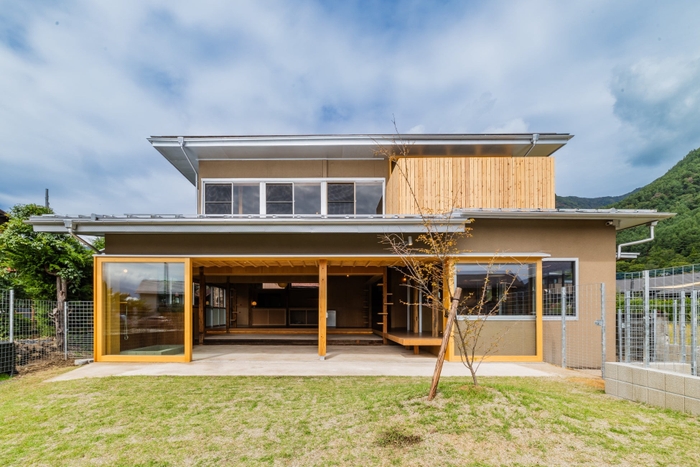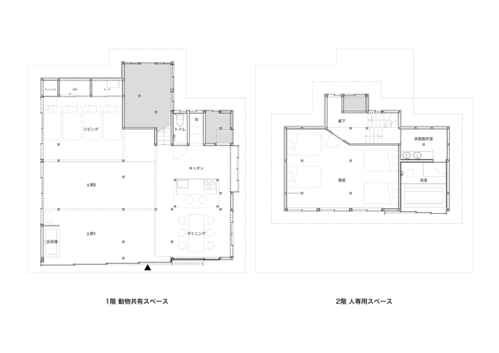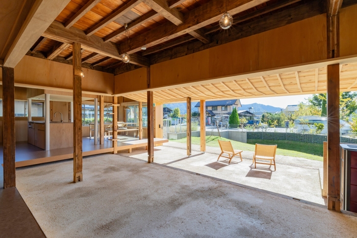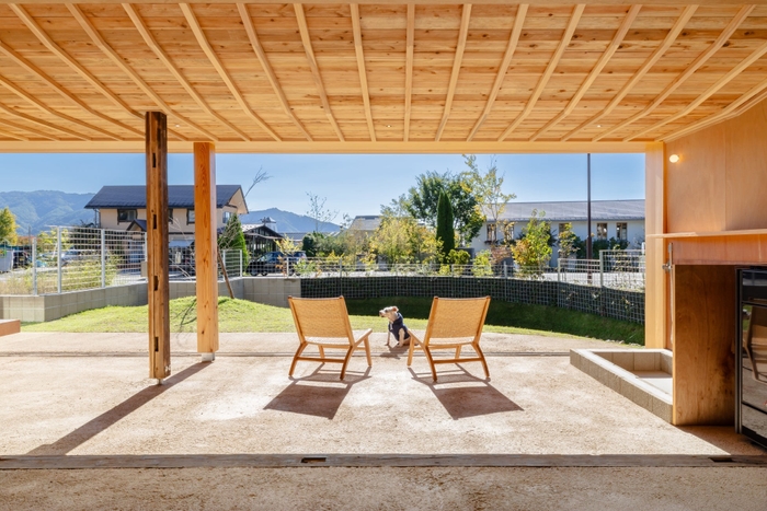 建物の内外を連続させた広い土間が、寝床や居間のすぐ隣まで続いていることで、広場を駆け回るワンちゃんたちも、たれ壁を飛び回る猫ちゃんたちも、土間で一緒に遊んでいる人たちやダイニングでご飯を食べたり本を読んだりしている人たちも、家族のみんなが常に身近な距離で過ごすことができます。