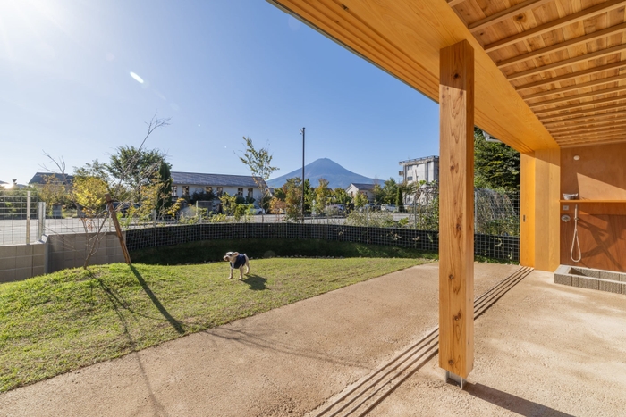 玄関窓を全開放させられる広々とした空間。春には桜が咲き誇り、富士山を望みながら愛犬が思いきり駆けまわれます。