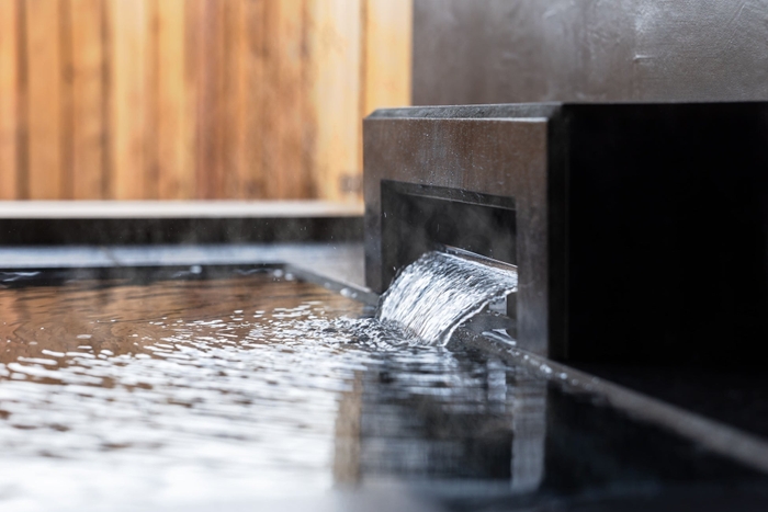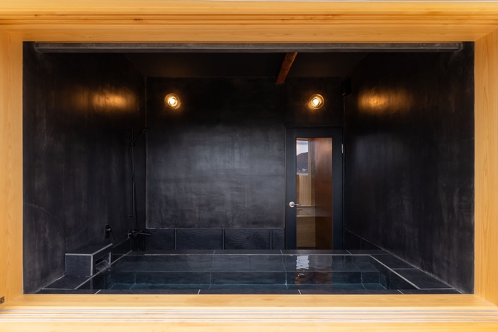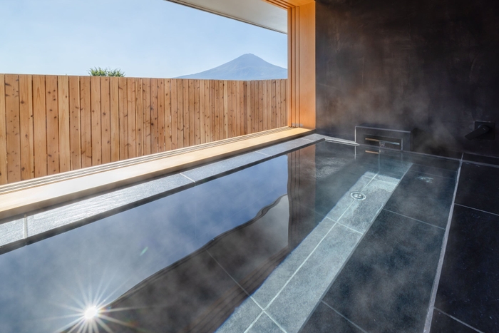 浴室は富士山の眺望を最優先に、2階に設置しました。浴室の窓はフルオープンにすることができ、遮るもののない富士山を独り占めにしながらゆっくりお風呂に入ることができる半露天風呂です。浴槽はゆったり浸れる広さを誇り、シックで落ち着いたダークトーンの空間。人が心から解き放たれる、特別な時間をお届けします。