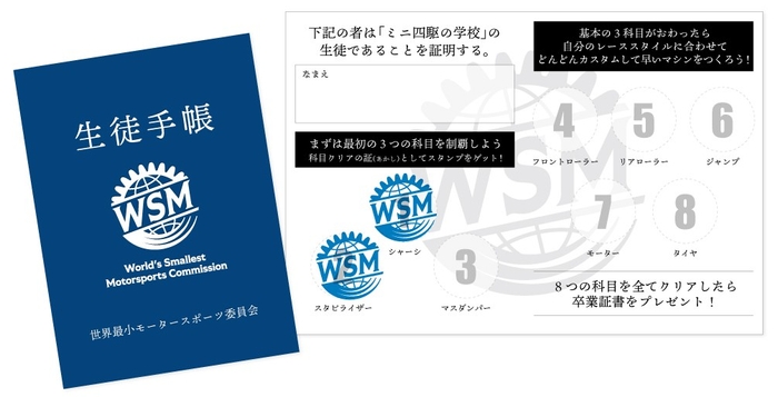 「ミニ四駆の学校」は、ミニ四駆の構造を理解しながら学ぶ8つの科目で構成。ものづくりを通して、探究心と試行錯誤の練習、競争心と挫折の経験、達成感と努力が実る喜び、学校外の友人やライバルとの人間関係、親子で協力する絆作りなど、多くのことを体験・体感する機会を提供し、子ども達の健全な育成を目指します。