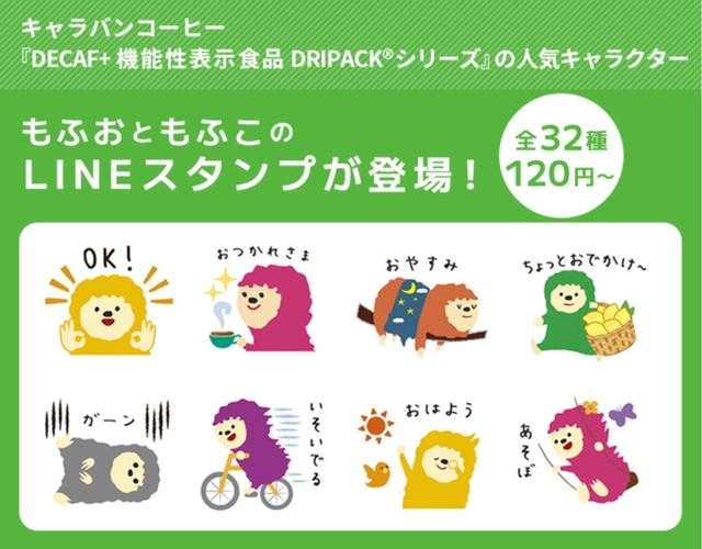 キャラバンコーヒー『DECAF+機能性表示食品 DRIPACK®シリーズ』の人気キャラクター『もふおともふこ』のLINEスタンプが出来ました!!もふおともふこは不思議な生き物。毎日使えるスタンプ集です。
