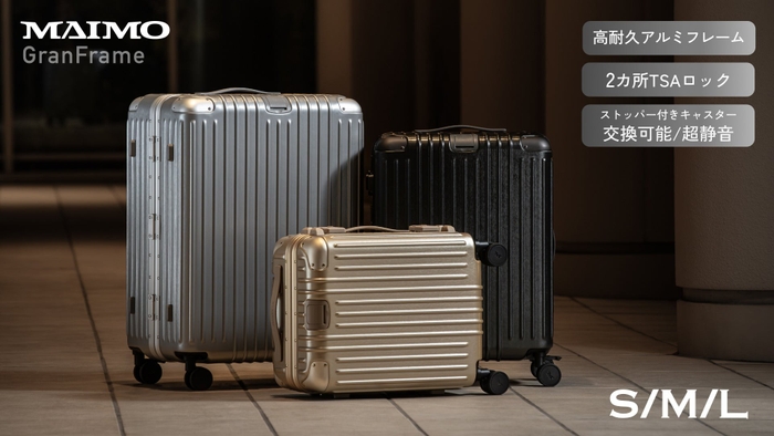 株式会社KURUKURUは、トラベルブランド **「MAIMO」** より、フレームスーツケース **「GranFrame」(グランフレーム)** の新サイズ **〈M・L〉** を2025年11月18日に発売いたします。好評のSサイズに加え、2泊から長期滞在まで対応できるサイズ展開に拡大し、旅や出張など幅広いシーンに合わせてより最適なサイズをお選びいただけるようになりました。