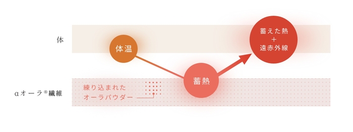 独自の温め素材「αオーラ繊維」を使用。天然鉱石「オーラストーン」を練り込んだこの繊維が、体温をじんわりと蓄えてお腹周りを心地よい温かさで包み込みます。生理痛や冷えでつらい時も、お腹にそっと手を当ててもらっているような安心感を提供します。