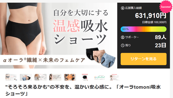 11月12日にMakuakeで先行発売を開始した「オーラtomoni吸水ショーツ」は、開始から1日で目標金額の500%を突破。その後も応援購入が伸び続け、想定を大きく上回る反響となっています。