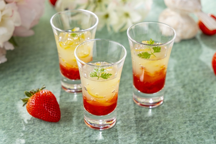 苺、レモン、ブルーハワイの3色が美しく重なる、神秘的なグラデーションゼリー。 中央のレモンゼリーにはナタデココを忍ばせ、トップにはりんごのコンポートを添えた、見た目も味わいも爽やかな一品です。