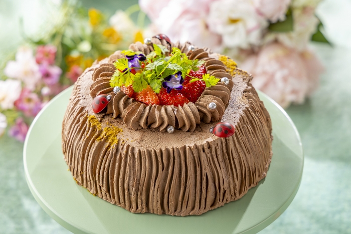 ふわふわの苺生地に苺クリームをまとわせ、たっぷりのベリーをあしらいました。ガーデンをイメージして緑色を添え、上品なデザインに仕上げました。