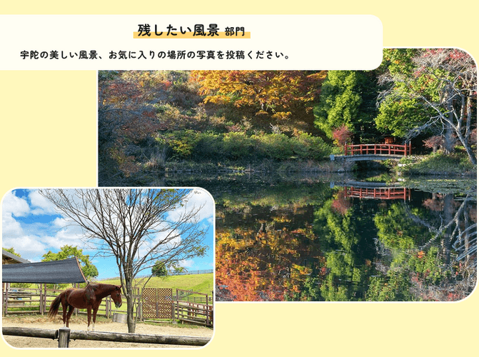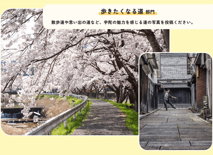 散歩道や思い出の道など、宇陀の魅力を感じる道の写真を「歩きたくなる道 部門」に、宇陀の美しい風景やお気に入りの場所の写真を「残したい風景 部門」に応募できます。