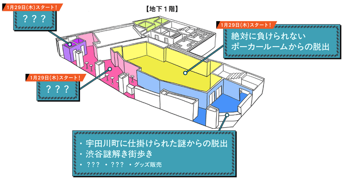 新作リアル脱出ゲームが登場するのは、ビルの地下1階/地下2階の2フロアに広がる「リアル脱出ゲーム CROSSING 渋谷店」のうち、地下1階フロア。2026年1月13日(火)から1月28日(水)は地下1階フロアの営業をお休みして、新しく始まるイベントの準備期間となります。
