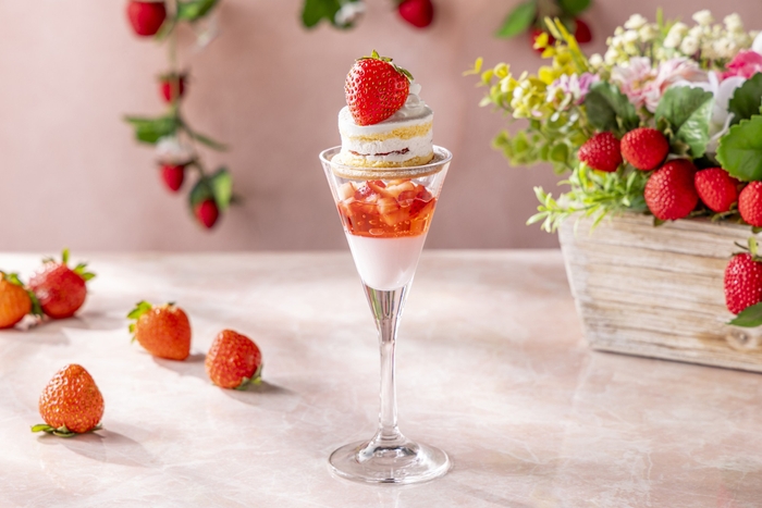 旬の苺が持つ甘酸っぱい魅力を多彩に表現したスイーツの数々には、苺のババロアとゼリーを2層に仕立てたグラスの上に、丸ごと苺のショートケーキを重ねたアイコニックなパフェをはじめ、練乳をスポイトでお好みに調整できる苺のマカロンや、ダージリンとホワイトチョコレートの香りが広がる苺のロールケーキなど、味わいと香りのバランスにこだわった7種のデザートが揃います。セイボリーは、苺と赤ワインビネガーが織りなす芳醇な香りがスモークダックの旨みを引き立てる一品や、苺とクリームチーズを巻いた華やかなラップロールなど、食事としても楽しめる6種をご用意。スコーンと紅茶やコーヒーとともに、優雅なティータイムをお過ごしください。