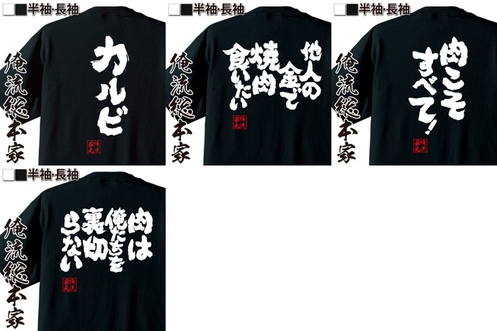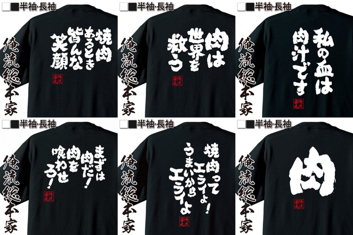 ラインナップは全10種!肉愛溢れる一言が背中にドーンとプリントされており、焼肉好きの心をくすぐること間違いなしです。肉への情熱を力強く、時にはユーモラスに表現しています。肉好きならずとも目を引く、会話の種にも最適なアイテムです。