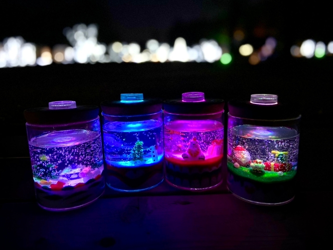 丸型・角型・ボール型グラスに雪だるまや星のパーツを飾り、自分だけの作品が作れます(制作約30分+仕上げ40分/1,400円〜)。LEDのジェルキャンドル作りを体験された先着100名様には、セボンのクリスマス限定オリジナル缶バッジをプレゼント。