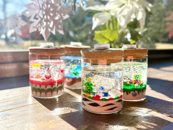 屋内の体験工房では、クリスマス限定デザインのジェルキャンドル作りを開催。