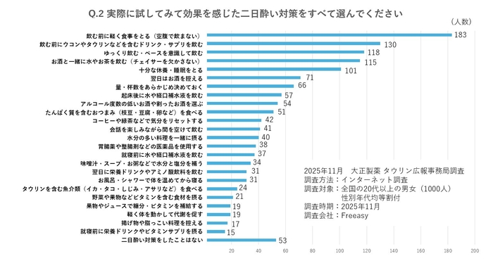 二日酔いの経験者に「実際に効果を感じた二日酔い対策」を聞いたところ、「飲む前に軽く食事を取る(空腹で飲まない)」(183人)、「飲む前にウコンやタウリンなどを含むドリンクやサプリを飲む」(130人)、「ゆっくり飲む・ペースを意識して飲む」(118人)、「お酒と一緒に水やお茶を飲む(チェイサーを欠かさない)」(115人)、「十分な休養・睡眠を取る」(101人)といった対策をしている方が多くいました。済生会横浜市東部病院の谷口英喜先生によると、翌日の体調不良の本質は、“脱水”と“肝臓の疲弊”にあるということ。アルコールの分解には多くの水とエネルギーが消費され、肝臓がフル稼働した結果、体全体の代謝とエネルギー供給が低下してしまうのです。