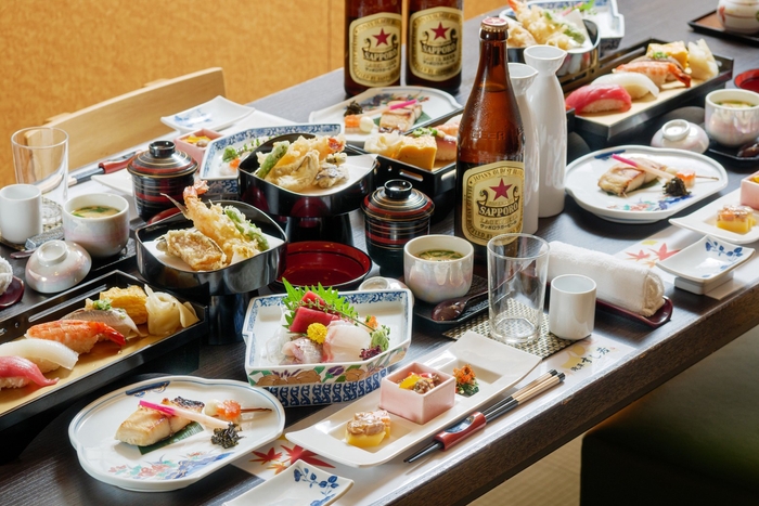 お店を支えるのは、熟練のプロフェッショナルたち。経験豊かな板前が一つ一つ丁寧に寿司を握り、鮮度抜群の刺身を豪快な「刺盛」に仕立てます。それだけでなく、和食職人が腕を振るう豊富な逸品料理も魅力。定番の天ぷらから季節の料理まで、日本の食文化を心ゆくまでお楽しみいただけます。