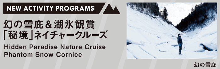 大雪ダム湖奥地の誰も入ったことがない秘境エリアで、幻の雪庇(雪の張り出し)や凍結した湖面を観賞するガイド付きツアーを実施。地質学や自然環境の解説を交え、大雪山国立公園の冬の神秘を体験。エコツーリズムを重視。スノーモービル牽引のラフトボードにて、スノーシューを着用し、ガイドが案内する約40分のツアー。雪庇や湖氷の成り立ちを解説。地元ガイドにより地域の歴史や自然文化を紹介することで魅力的に観察できます。