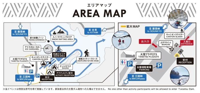 ※上記以外にも、アイスカルーセル体験や冬遊びコンテンツもご用意しております!各種コンテンツご参加のお客様以外は、大雪ダム湖内会場への入場はできません。