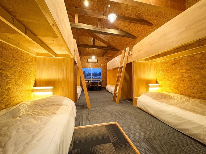 ホテル一望に併設された地域内で最安値の素泊まり専用宿。最大8名まで宿泊可能な“エイトスリーパーズルーム”は、仲間と語らい、深い眠りへと導かれる空間。家族や友人、修学旅行、グループ旅に最適な洋室です。