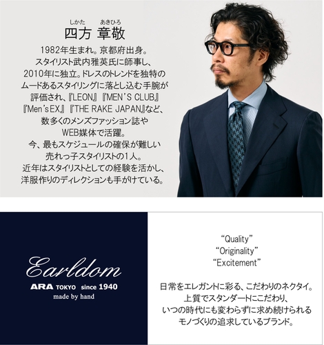 1940年創業のアラ商事(本社:東京都中央区、代表取締役:荒川 徹)は、多くのメンズファッション誌で活躍中の人気スタイリスト四方章敬氏と自社ブランド「Earldom(アールダム)」がタッグを組み、クラウドファンディングのMakuake (マクアケ)で先行販売スタートしました!