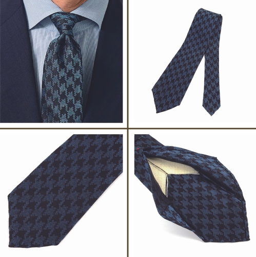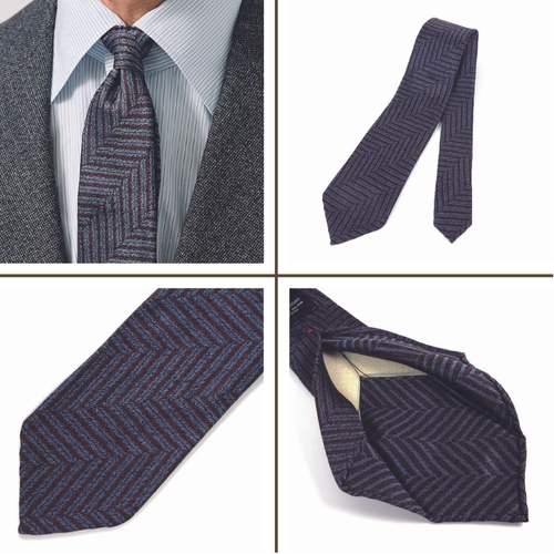 「ジャカードタイを軽く仕上げるのはとても難しいのですが、アラ商事はもともと極上のシルクジャカードタイで発展してきたメーカー。織り方や使用するシルク糸の選定、フィニッシングの工程などにとことんこだわっていただき、今回、驚くほど軽いジャカード生地が完成しました。クラシックなスーツにも映える重厚な見た目なのに、着用すると抜群に軽い。そんなギャップを楽しんでいただけたらと思います」(四方さん)
