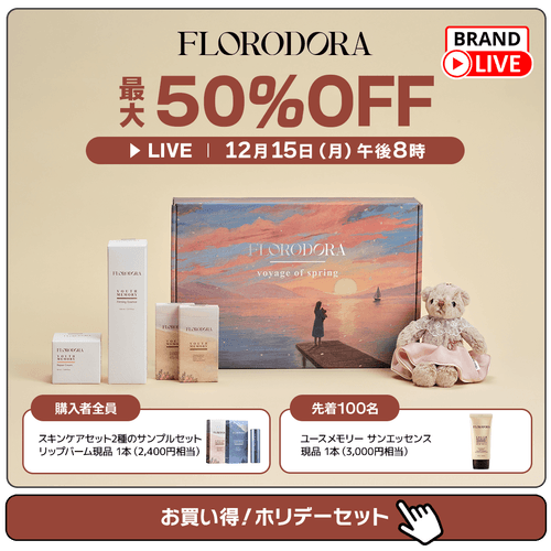 :ライブ配信中「購入しました」認証と注文番号をコメントいただいた方の中から抽選で10名様にFLORODORAオリジナルグッズをプレゼント