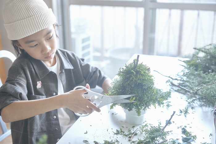 自宅でも楽しめるホリデー体験を求めて、表参道の人気フラワーショップ〈ディリジェンスパーラー〉協力のもと、フレッシュなグリーンを使った“ミニクリスマスツリーづくり”をレクチャー。