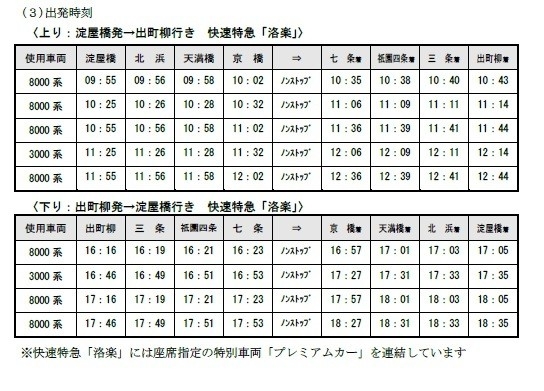 (2)停車駅:淀屋橋、北浜、天満橋、京橋、七条、祇󠄀園四条、三条、出町柳