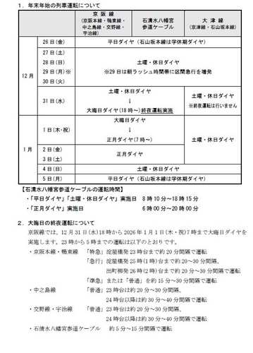 京阪電気鉄道株式会社(本社:大阪市中央区、社長:井上 欣也)では、京阪線と石清水八幡宮参道ケーブルにおいて、大晦日の終夜運転を実施します。また、元日から1月3日(土)にかけて初詣や初春のお出かけに便利な正月ダイヤで列車を運転します。